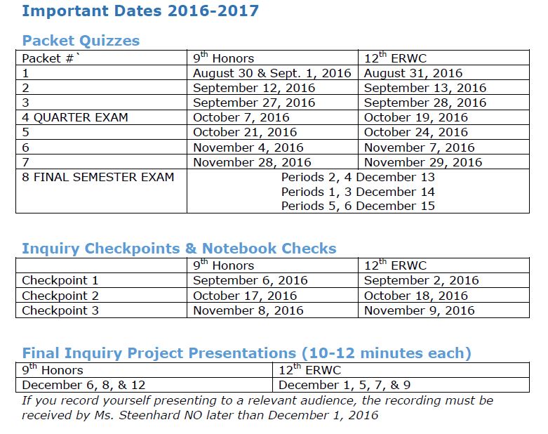 At the beginning of each class after completing grammar on Mondays, Tuesdays, and Wednesdays, you will be given 20 minutes to read, view, or listen to texts that will support a semester-long inquiry. You may choose any topic (appropriate for school and approved by your parent/guardian) to inquire about. For example, if you choose to read a science-fiction book, you can follow that with a podcast interview with the author as you inquire about how to write a science fiction text. Or, if you want to learn about the mechanics of cars, you could listen to podcasts, watch documentaries, and read instruction manuals. A few weeks prior to the end of the semester, you will turn in a project that demonstrates all you have learned through this inquiry. Take advantage of the freedom you have in this inquiry, but make sure to meet the minimum requirements below.